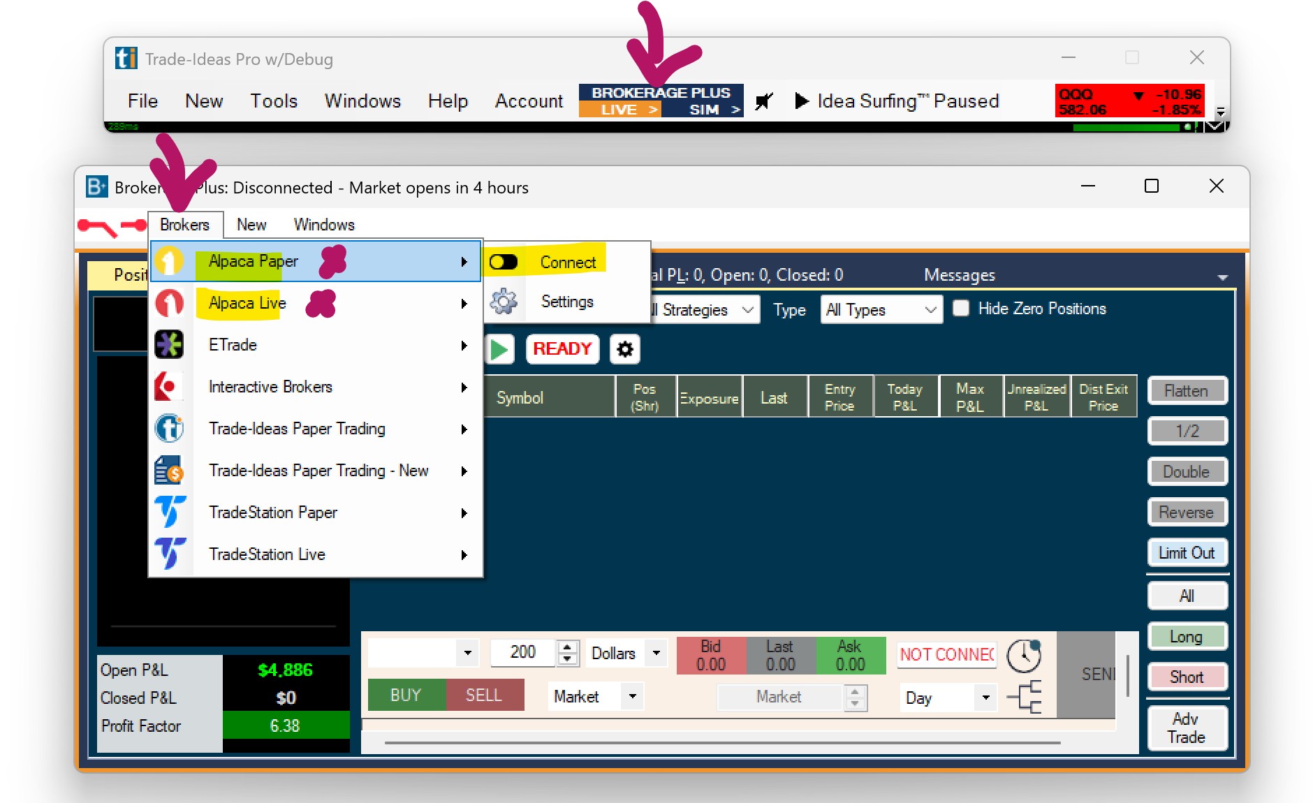 To connect your Alpaca Live or Paper Trading account to the Brokerage Plus module of Trade Ideas Pro follow these steps: